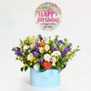 Wish you beloved one a cheerful birthday with a joyful burst of colour and elegance. This 20 cm blue round box is filled with lush roses, accented by bright yellow and purple touches, and topped with a cheerful Happy Birthday balloon.