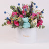 We paired fragrant deep purple roses with veronica stems, sweet chamomile and eucalyptus leaves with blue Crespidia to create the perfect Baby Boy arrangement.
