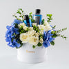 Show your love and appreciation to the special man with this super cool box of white roses, baby roses and blue hydrangeas combined with a shower gel and body spray.