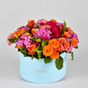 This arrangement is like a garden full of freshly picked blossoms, our happy colored arrangement is a true delight. This mix of pink and orange flowers with a touch of greenery is creatively styled in our baby blue box. Send it today and add a breeze of freshness for their home.