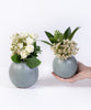 This elegant duo speaks for itself with pretty white baby roses, wax stems and delicately complemented with Skimmia in a small and medium green ceramic vase.